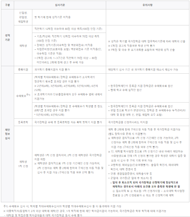 국가 장학금 심사기준은 편입생, 신입생, 재입학생 은 첫 학기에 한해 성적기준이 미적용되고